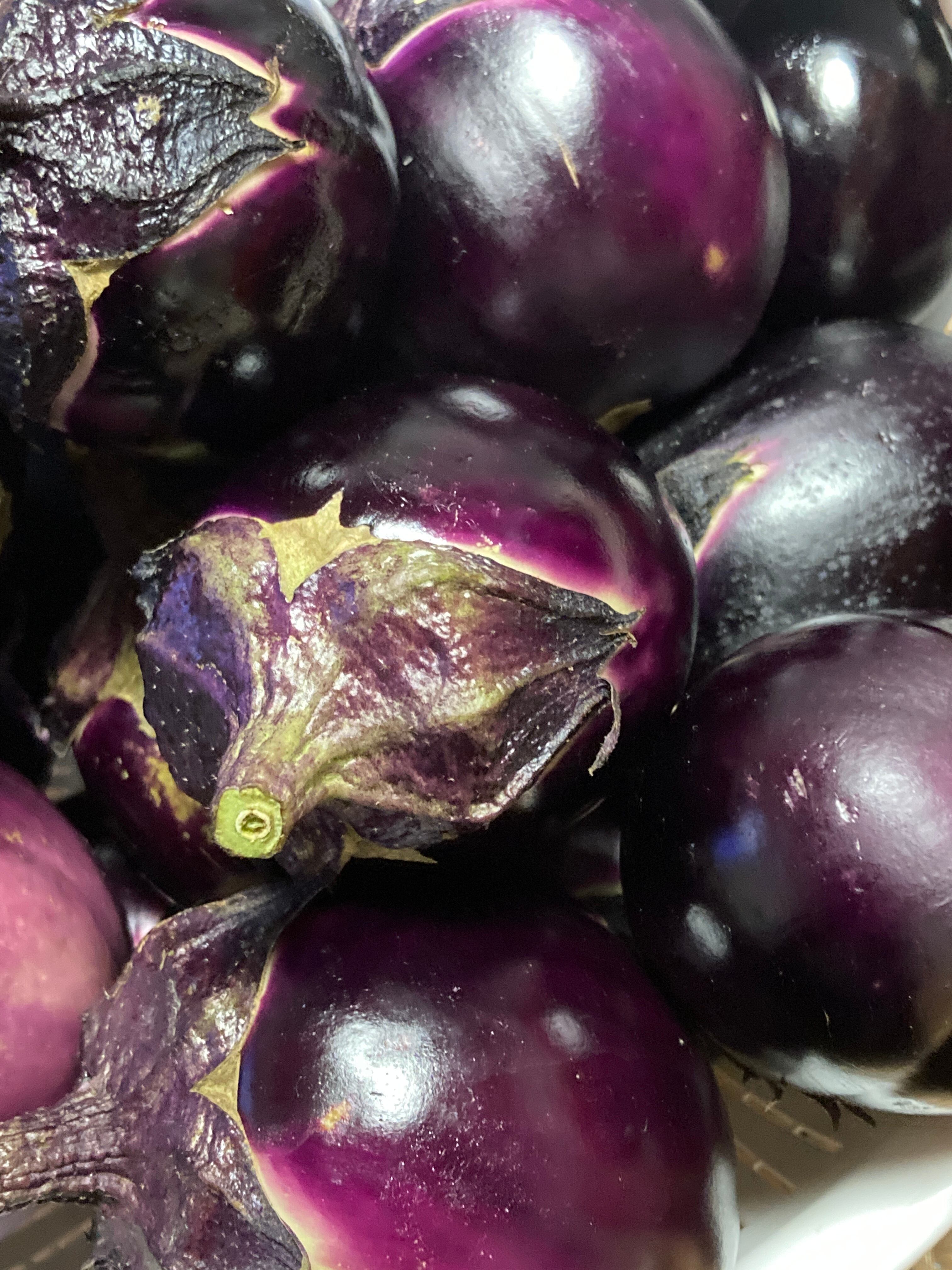 本来は漬物用小ナスとして栽培されている薄皮丸ナスです。山形のおきたま地方ではお盆のふるさとの味です。独特の歯ごたえがあり、漬物にしても良し、大き目のものは、焼きナスや煮物など、様々な料理に応用が出来る大変便利な野菜です。ナスが紫色をしているのは、アントシアニンという色素が関係しています。この色素は、ブルーベリーの藍色と同じ成分です。他にも、ナスニンやルチンといった成分も含まれています。